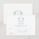 Delikate romantische hellblaue Hochzeitskarte RSVP mit Bräunungs- und Bräutigam-Monogramm auf Vintagem Wappen dekoriert mit blauer und weißer Blume Blüte.