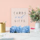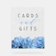 Hochzeitskarten und Geschenke undurchsichtiges Zeichen. Blaue Hydrangea-Blume grenzen an den Boden dieses Acrylzeichens. Schwarz gedruckter Text und blaue "und" Formulierung im Skript. Mit dem Holzständer gezeigt, was optional ist. Dieses Design wird auch auf andere, größere Größen übertragen.