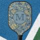 Dieses anpassbare Ladys Pickleball Paddel weist ein gelbes und blaues Muster auf, das von einem William Morris Design mit einem personalisierbaren Monogramm adaptiert wurde. Es ist ein stilvolles Accessoire, das ein gutes Geschenk für jede Frau wäre, die pickleball spielt.