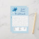 Fügen Sie Ihrem Brautparty eine Touch von Eleganz und Spaß hinzu mit diesem anpassbaren Blue Floral Word Search Game! Mit einem schönen und raffinierten blauen Blumendesign ergänzt diese Spielkarte Ihre Veranstaltung und bietet den Gästen eine unterhaltsame Unterhaltung. Personalisieren Sie den Text mit dem Namen der Braut, Duschdatum, für eine wirklich einzigartige Touch. Feiern Sie stilvoll und unterhalten Sie sich mit diesem eleganten, individuell gestaltbaren Brautparty! (Wortsuche und Wortnamen können nicht bearbeitet werden)