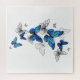 Flying Blue Butterflies Morpho und weiße Schmetterlinge auf einem hellen abstrakten Hintergrund. Morpho. Design mit blauen Schmetterlingen Morpho.