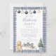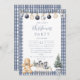 A charming Christmas invitation featuring navy blue gingham borders, watercolor ornaments, and a cozy vignette of a gingerbread cookie, sleigh of gifts, and festive tree. The design blends classic holiday warmth with elegant blue tones — perfect for chic winter gatherings or family celebrations.