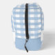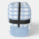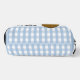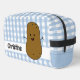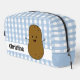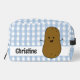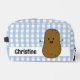 Bewundernswerte Kosmetiktüte mit einer niedlichen Cartoon braunen Kartoffel. Der Hintergrund ist ein niedliches, klassisches Muster von blau-weiß Gingham. Eine Vorlage, um Ihren Namen zu personalisieren.