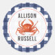 Ein Hochzeitsaufkleber mit einer Abbildung einer Krabbe über einem blauen Gingham-Hintergrund.