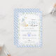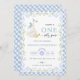Celebrate your baby’s first birthday with a whimsical and heartwarming invitation! Featuring a cute white goose with a party hat and blue bow, floating against a soft background. The design is framed with a blue gingham border, decorated with ribbons, green leaves, and blue flowers—perfect for a cheerful party vibe!