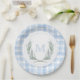 Eine klassisch blaue Gingham Wasserfarbe mit einem Lorbeerkraut Wappen für das erste Monogramm.
