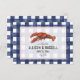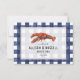 Eine rustikale Hochzeit rettet das Datum mit einer Illustration eines Hummers über ein verwittertes blaues Gingham-Design mit schwarzem Text vorne.