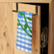 Küchenhandtuch mit dem Bild eines Blumenstraums vor blauem und weißem Gingham-Hintergrund.