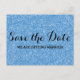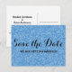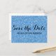 Chic und eleganter Glitzer Save the Date Postcard mit einem blauen Glitzer sehen digitale Kunstgeschichte aus. Einfach an Ihre Hochzeitsdetails anpassen. Klicken Sie für weitere Anpassungsoptionen auf die Schaltfläche Anpassen. //NICHT WIRKLICHER GLITZER - DIGITAL ART DRUCTED FLAT BILD//