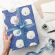 Dieses Weihnachtspapier an der Küste zeigt ein Muster von weißen Sand Dollar auf einem marineblauen Imitat Glitzer Hintergrund.