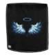 Helle, künstlerische, blaue Engelsflügel auf schwarzem Hintergrund. Engel Flügel.