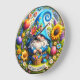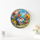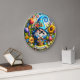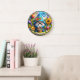 This vibrant round wall clock features a whimsical 3D-style digital illustration of a cheerful garden gnome celebrating the arrival of spring. The gnome wears a bright blue textured hat with a playful spiral tip and holds a woven wicker basket overflowing with colorful spring blossoms. A beautiful assortment of oversized flowers, including a golden sunflower, pink tulips, and purple lavender, circles the gnome in a lush floral wreath. At the bottom, a white parchment banner displays the friendly greeting "HELLO SPRING" in bold blue lettering. The design is set against a soft sky-blue background with tiny butterflies and sparkling accents. This functional piece of home decor is a perfect seasonal gift, ideal for brightening up a kitchen, sunroom, or entryway with its joyful and high-energy floral aesthetic.