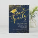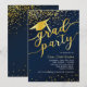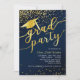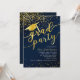 Dieses Abschluss Einladungs-Design verfügt über einen dunkelblauen Hintergrund mit goldenen Glitzer Konfetti, Abschluss Hut mit Tassel und "grad Party" Schriftart.