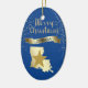 Gib ihnen etwas hübsches vom großen Staat Louisianas! An der Vorderseite dieses Ornaments befindet sich ein glänzendes goldfarbenes Silhouette-Bild des Staat mit einem dunkleren goldenen Stern. Über dem Staat und Sternbild ist die glitschige Nachricht MERRY CHRISTMAS in Skript, und ein Banner mit dem Text in blau LOUISIANA. Um das Ganze herum gibt es goldene Schneeflocken. Die Bilder und der Text werden auf einem tiefblauen Hintergrund platziert. Auf der Rückseite des Ornaments befinden sich Textfelder in hellem Gold, die Sie anpassen können, und ein zweites goldenes Sternbild. Sie können die Hintergrundfarbe ändern, wenn Sie möchten, indem Sie CUSTOMIZE wählen.