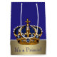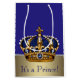 Prince Baby Dusche Geschenktasche mit wunderschöner königsblauer und goldener Krone auf einem reichen königsblauen und goldenen Hintergrund. Sie können den Text ändern oder entfernen.