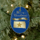 Gib ihnen etwas hübsches vom großen Staat von South Dakota! An der Vorderseite dieses Ornaments befindet sich ein glänzendes goldfarbenes Silhouette-Bild des Staat mit einem dunkleren goldenen Stern. Über dem Staat und Sternbild ist die glitschige Nachricht MERRY CHRISTMAS in Skript, und ein Banner mit dem Text in blau SÜDDAKOTA. Um das Ganze herum gibt es goldene Schneeflocken. Die Bilder und der Text werden auf einem tiefblauen Hintergrund platziert. Auf der Rückseite des Ornaments befinden sich Textfelder in hellem Gold, die Sie anpassen können, und ein zweites goldenes Sternbild. Sie können die Hintergrundfarbe ändern, wenn Sie möchten, indem Sie CUSTOMIZE wählen.