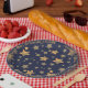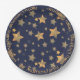 Elegant vintage Christmas paper plates featuring gold star pattern on blue background. Personalize your family name to enjoy your Christmas party with your loved ones this holiday season.