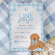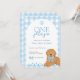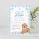 Celebrate your little boy's first birthday with this "One Golden Year" birthday invitation. This adorable invitation features blue gingham, a golden doodle wearing a blue bow, and playful paw prints. Perfect for dog loving families, this sweet design adds a charming touch to any first birthday party.