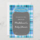 Personalisierte Babydusche Einladungen in elegantem und modernem, hellblau, aquamarin, graues und weißes kariertes Muster mit niedlicher Mason-Glas-Abbildung. Anpassbar mit Ihrem Text, kontaktieren Sie uns, um eine Farbänderung anzufordern.