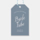 Bridesmaid Vorschlag Gift Tag Cards. Diese fragend Bräunungskarte enthält die Worte "Brautstamm" in einem weißen Kalligraphie-Schriftart auf einem schleichtblauen grauen Hintergrund. Sie können die Wörter ändern, um Ihre Einladung zu personalisieren, was Sie wollen. Diese Geschenketiketten paaren sich wunderbar mit meinen Brautparty-Vorschlagskarten und ergänzen Ihre fragend Brautjungfrau, Trauzeugin und Blume Mädchen Geschenke. Weitere Informationen finden Sie unter www.zazzle.com/vginvites.