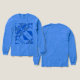 An abstract, contemporary art graphic is featured, with influences both from Southwest art and the Mid-Century Modern style. This geometric design consists of a combination of shapes in medium blue and gray, with the overall pattern slanted on the diagonal. An artistic and trendy look for your casual and everyday wardrobe, which also has a tropical and beachy or surf vibe. Pictured here on a "true royal" blue long-sleeved Tri-blend t-shirt , with other styles and colors available to choose from. Since the shirt lends an artistic vibe and individualized style, this contributes to a feeling of being "put together," which can be especially invigorating for those who work remotely and/or spend a lot of time at home.