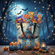 A cute witches hat on a blue pumpkin with a bat background Halloween personalized trick or treat bag.