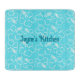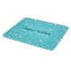 Aqua blauer Schnitt mit Hibiskus Blume Muster. Fügen Sie dem Zentrum einen Namen hinzu, wie z.B. "Jaynes Küche", oder entfernen Sie den Text, um ihn leer zu bestellen. Das Blumendesign besteht aus weißen Konturen, die auf einem hübschen, blauen Hintergrund gehalten sind. Text ist dunkelblau.
