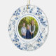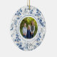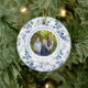 A circle ornament with a blue holly floral pattern on the front and back. There is space for a special photo and one line of text for names, greeting, etc. on the front, and 2 lines of text for names, year, or greeting on the back.