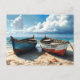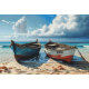 "Blue Horizon". Eine farbenfrohe, entspannende Bootslandschaft. Sandküsten und Ruderboote laden zu einem erholsamen Ausflug ein, bei dem Meer und Himmel zu einer Leinwand der Entspannung verschmelzen. Eine farbenfrohe Wasserfarbe in sanfter Blues und Sandfarben.