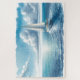 A serene coastal watercolor portraying a solitary sailboat gliding across calm blue waters beneath expansive, cloud-filled skies. Soft gradients of aqua, cerulean, and sunlit white create a tranquil rhythm, while gentle reflections ripple across the sea, evoking quiet movement and open possibility. The composition feels airy and contemplative, balancing vast sky and water with a sense of peaceful journey and timeless escape. This artwork captures a soothing coastal mood rooted in calm, freedom, and light, perfect for those drawn to breezy horizons and reflective moments by the sea. AI generated artwork.