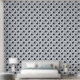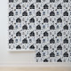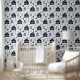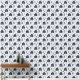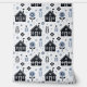 Rustic house pattern with dark houses and funny blue flowers on light grey background.