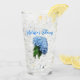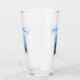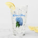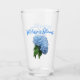 Blauer Hydrangea-Stamm, Schnittbild der Blume auf Klarglasware. Große Trinkgläser haben auf beiden Seiten die Blume. Hellblaue Blütenblätter und grüne Blätter an der Spitze eines kurzen Stammes.