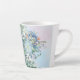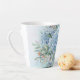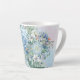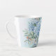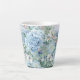 Diese hübsche Latte Tasse zeichnet sich durch ein wunderschönes Aquarellblütendesign mit Hydrangeas und anderen Blume in Pastellblau aus. Es gibt zwei Größen.