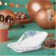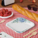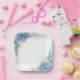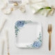 Die Papierplatte wird in einem schönen blauen Hydrangeas-Druck auf der quadratischen Platte gezeigt.