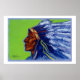 Der antike indische Chef trägt einen Stilpunkt von seinem Herzen und sieht die Schönheit um ihn herum, während er mit Chaos konfrontiert wird, er sieht Frieden. Blau Indianer absorbieren die Versuche der Maschinenwelt mit einem Blick, der das Leben trägt.