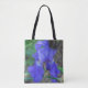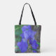 Ein nahes Foto einer wunderschönen blauen Iris-Blume, die auf beiden Seiten eines Totensacks aufgedruckt ist.