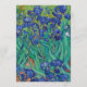 This floral invitation has as a background a irises painting by Van Gogh (now in the public domain).. The text is in a transparent white arch.. The occasion "Wedding" and the names are written in a blue elegant calligraphic script, the rest in small black caps.