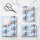 Ein blauer Jay-Vogel umgeben von rosa, lila und pfirsichfarbenen Frühlingsblumen Set vor einem hellblauen Hintergrund.