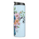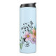 Ein blauer Jay-Vogel umgeben von rosa, lila und pfirsichfarbenen Frühlingsblumen Set vor einem hellblauen Hintergrund.