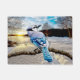 Eine hübsche blaue Jay-Pose vor einem winterlichen Hintergrund.