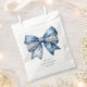 Die hübschen Gefälligkeitstaschen für eine köstliche Babydusche, die den Charme eines Landes verkörpert! Dieses bezaubernde Design präsentiert einen blau-jean druckenden Coquette-Bogen, der mit exquisiten Perlen und Spitzen-Details geschmückt ist, die eine Touch Eleganz verleihen. Der schöne Kontrast zum weich-weißen Hintergrund schafft eine auffallende visuelle Anziehungskraft. Machen Sie dieses außergewöhnliche Stück wirklich zu Ihrem, indem Sie es mit Ihren einzigartigen Details personalisieren.