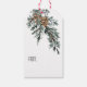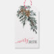 Ein Geschenktag mit Aquarellfarben bemalten Wacholderbaum Zweig mit Kegel, und Frohe Weihnachten am Boden in einem modernen Skript-Schriftart geschrieben.