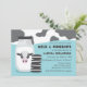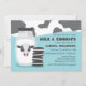 Wenn Ihr Baby-Dusche Thema ist Milch und Cookies, dann ist diese Einladung perfekt für Ihr Party! Dieses Design umfasst eine Milchflasche und eine niedliche Kuh vorne mit einem Keksstapel. Im Hintergrund ist ein Kuhmuster. Die Farben sind schwarz, weiß und blau.