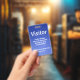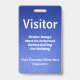 Vertikales Visitor's Pass Abzeichen in blauem Gradientendesign. Alle Elemente sind veränderbar oder abnehmbar. Zu den Elementen gehören: Besucher (kann sagen "Gast" oder "Pass" oder jedes Wort, die Phrase "Besucher Abzeichen muss zurückgegeben werden, bevor das Gebäude, Firmenname, Abteilung Unternehmen, Security Barcode Scan ist auf der Rückseite und kann geändert oder entfernt werden. Steckplatz oben für den Lanyard, aber Sie können eine andere Option wählen, wie z.B. eine Metallklammer oder ein Retraktikriemen.