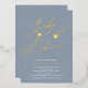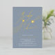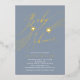 Gold Foil Baby Dusche Einladung mit einem modernen Script-Set auf einem staubigen blauen Hintergrund.