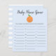 Niedliche kleine Süsse Thema Baby Dusche Baby-Name-Spielkarte mit Illustrationen einer orangefarbenen Frucht. Die Texte sind bearbeitbar. Perfektes Spiel während der Dusche. Es frage den Gästen, Babynamen aufzuschreiben, die mit jedem Alphabet beginnen. Wer zuerst alle Alphabete beendet, gewinnt!