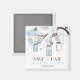Eine niedliche und skurrile Illustration von hellblauen Maurerkrümeln, Livebirden, Blume und Herzsaiten, die alle auf Baumzweigen stehen. Diese lustige und romantische speichern Sie das Datum Magnet ist perfekt für eine Sommer-oder Frühling Hochzeit.