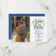 Blue Mediterranean Cheerful Floral Classic Chalice Lemons & Flowers Wedding Save the Date Cards with Photo and Back Modern QR Code.