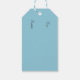 Ein Hanukkah Geschenktag mit einer türkisblauen Menorah auf grauem marmoriertem Hintergrund und Happy Hanukkah Text.
