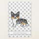 Desteis originelle Cartoon-Illustration einer niedlichen blauen Merle-Farbe Cardigan Welsh Corgi Rasse Hund. Es gibt auch einen personalisierbaren Textbereich für einen Namen oder Titel. Der Hintergrund hat ein hellgraues Muster von Hundepfauendrucken.